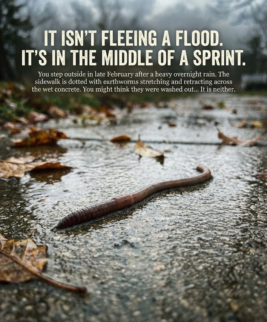 You step outside in late February after a heavy overnight rain. The sidewalk is dotted with earthworms stretching and retracting across the wet concrete.